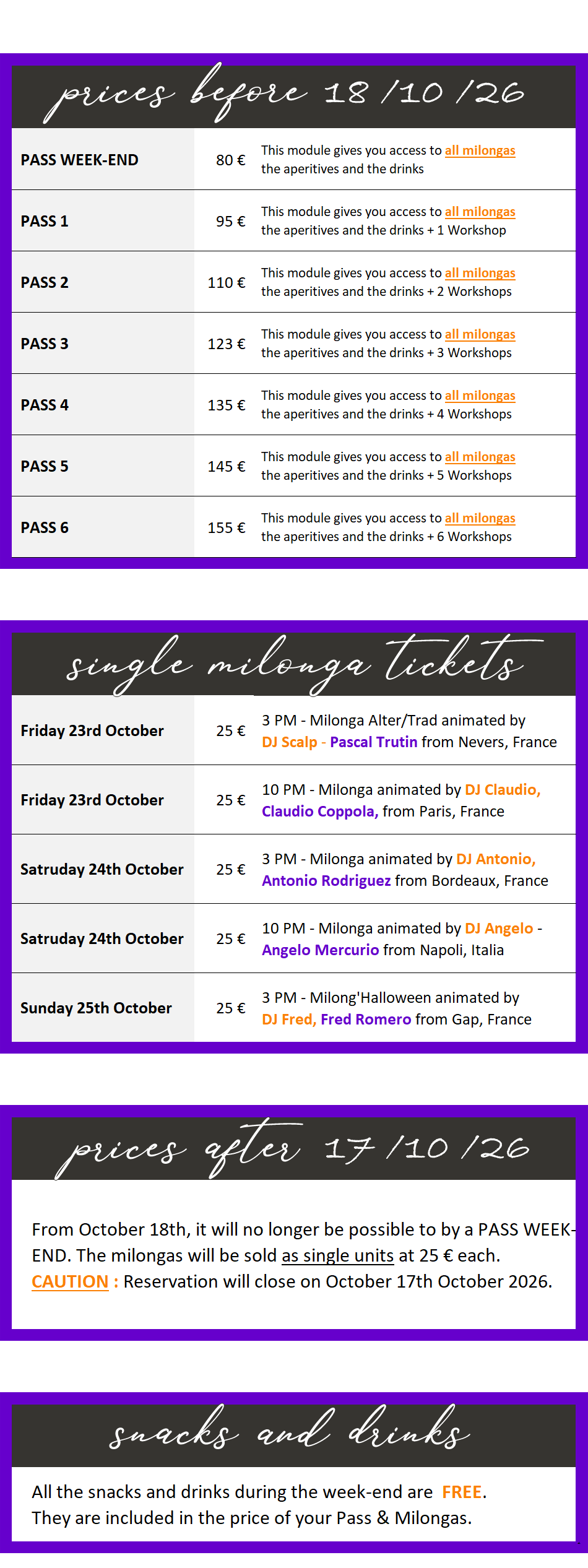 For the marathon as for the workshops with Laura & Sebastián, all reservations are to be made with the Limoges Tango A Vivre Association. Prior reservation is recommended and must be received by 17 October 2026. After this date, it will no longer be possible to register in advance. The services will be sold on site but within the limits of available places. In addition, for workshops as for milongas, the number of participants being limited, we advise you to book as soon as possible as registrations will be closed without advance notice.